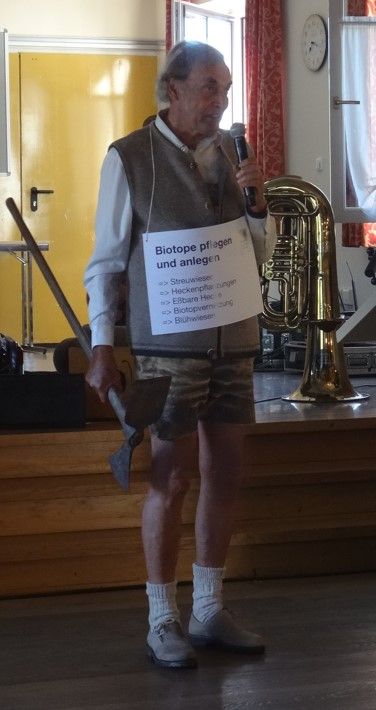 „Ich möchte Politiker jetzt nicht als Schwammerl bezeichnen“, hatte der 1. Vorsitzende der Kreisgruppe, Rainer Auer gesagt, als er einen solchen, nämlich den bloßen Fruchtkörper des weitverzweigten Lebewesens Pilz hochhielt. Unsere herausgehobenen Repräsentanten bräuchten tatsächlich laufend Impulse aus intelligenten Netzwerken aktiver Bürgerinnen und Bürger. Für diese dankte er den etwa 110 anwesenden Mitgliedern, von denen fast alle seit Jahren aktiv für Natur und Heimat wirken und werken.