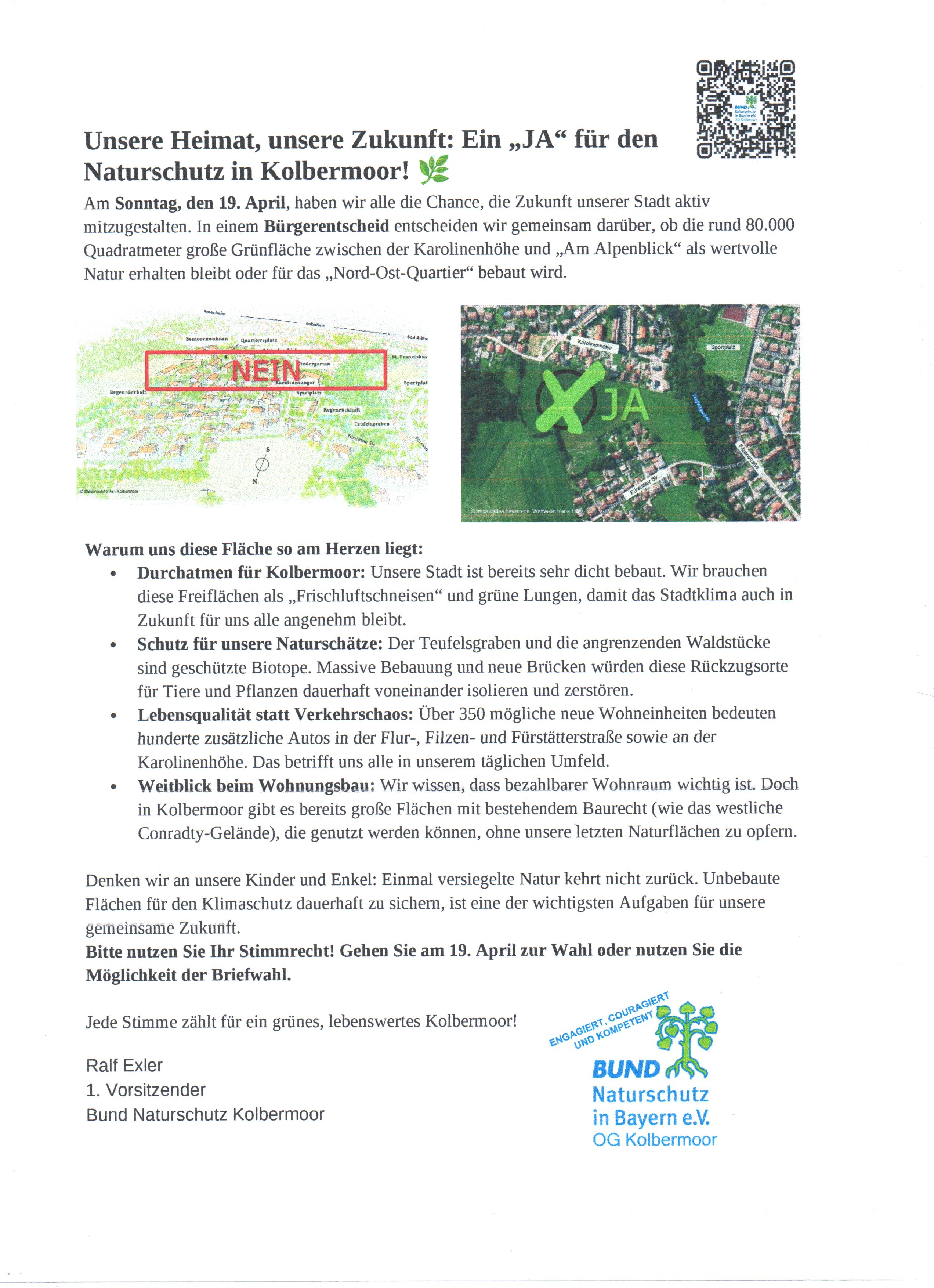 Da immer wieder vorgebracht wird, dass bezahlbarer Wohnraum benötigt wird, weist der Bund Naturschutz darauf hin, dass es in Kolbermoor noch große, ausgewiesene Flächen gibt (z.B. im Conradty- und Spinnerei-Gelände), die noch bebaut werden können und auch die Nachverdichtung in vollem Gange ist.