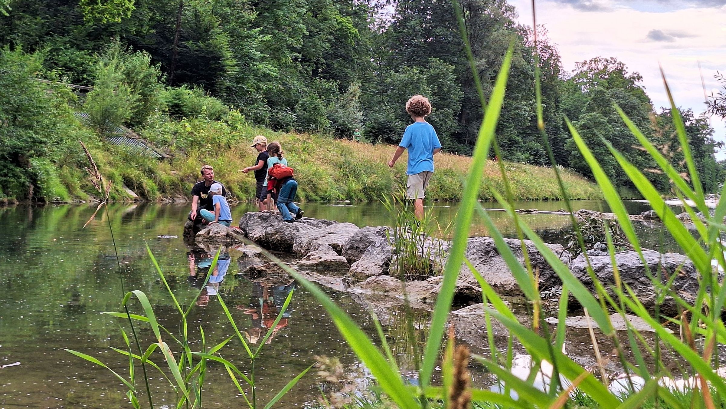 An der Mangfall, nahe der Kunstmühle, konnten wir durchs Dickicht streifen, am Wasser spielen, große und minikleine Fische beobachten und einen merkwürdigen Stein finden, den wir um ein Haar mit einer Schildkröte verwechselt hätten.