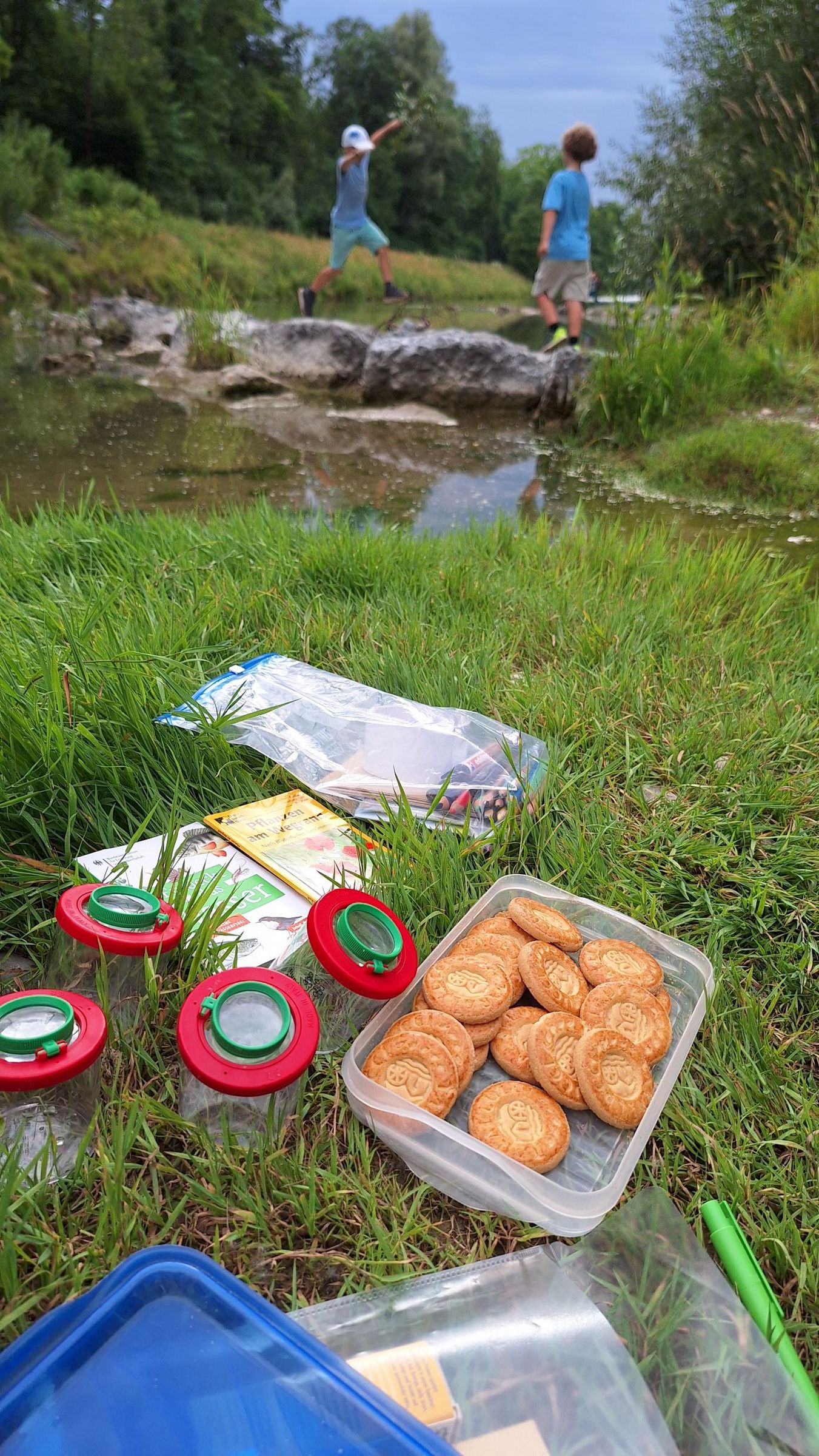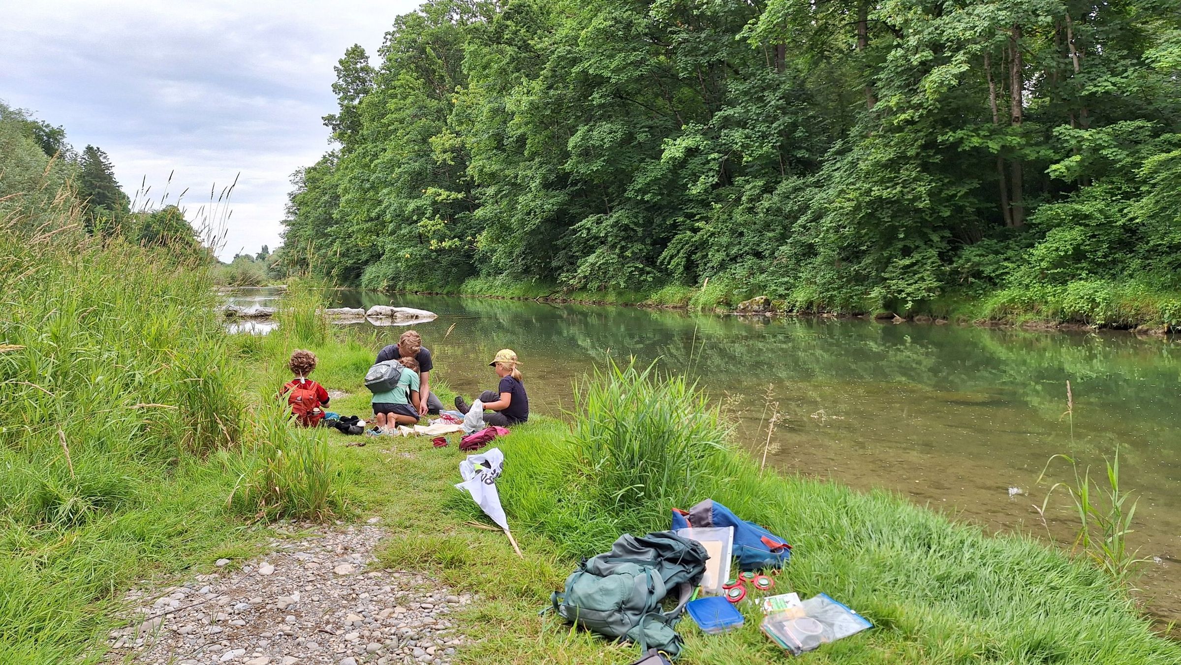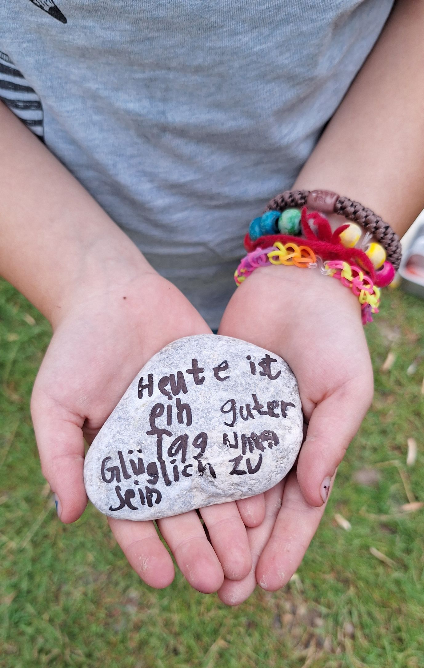 An der Mangfall, nahe der Kunstmühle, konnten wir durchs Dickicht streifen, am Wasser spielen, große und minikleine Fische beobachten und einen merkwürdigen Stein finden, den wir um ein Haar mit einer Schildkröte verwechselt hätten. Mit den Becherlupen ließen sich kleine Wassertierchen toll beobachten. Es gab Kekse und einen überraschenden Regenguss. Zum Schluss hatten wir die Idee, Kieselsteine mit mutmachenden Botschaften zu beschriften und auf dem Rückweg als kleine Überraschung für Spaziergänger am Wegesrand zu verteilen. Uns sind jede Menge ermutigende Botschaften eingefallen, und zum Schluss hatten wir alle die Melodie von Max Raabe im Ohr: „Heute ist ein guter Tag um glücklich zu sein!“ 😊