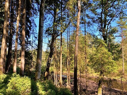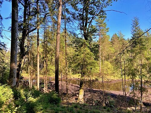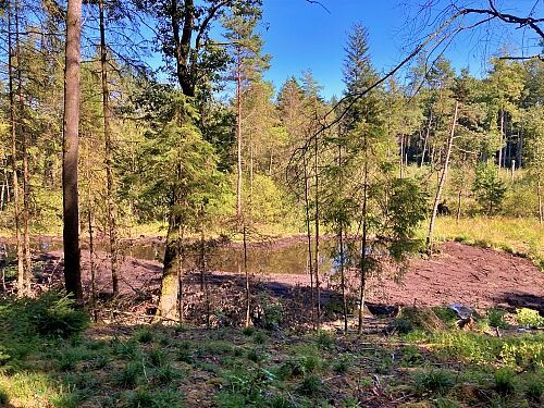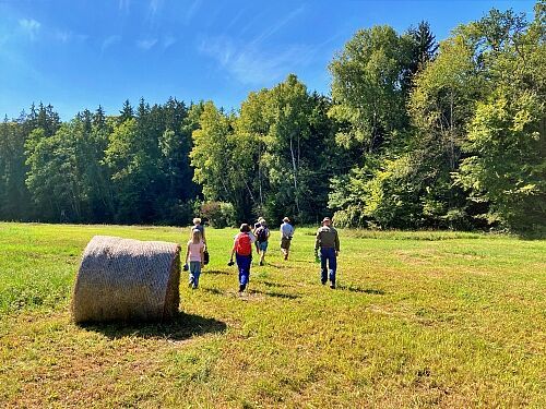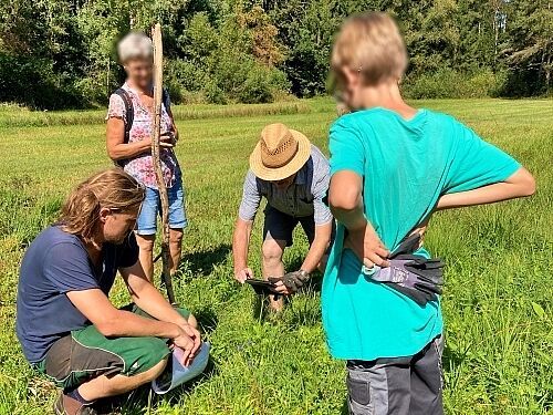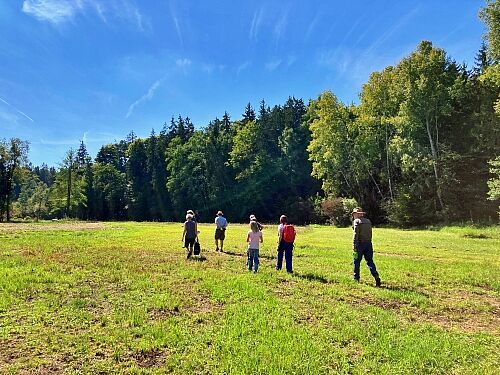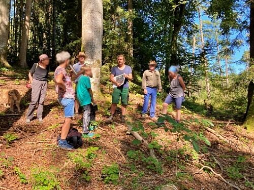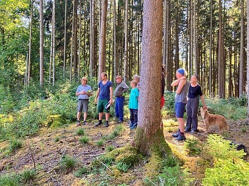 Jonas Garschhammer präsentierte den Pflege- und Entwicklungsplan zur Renaturierung blumenreicher Streuwiesen des in den 1980er Jahren illegal mit Fichten aufgeforsteten Bereichs. Die bereits durchgeführten Arbeiten wurden vorgestellt, die geplanten Maßnahmen und Ziele erläutert sowie der Erlen-Eschen-Auwald besichtigt.