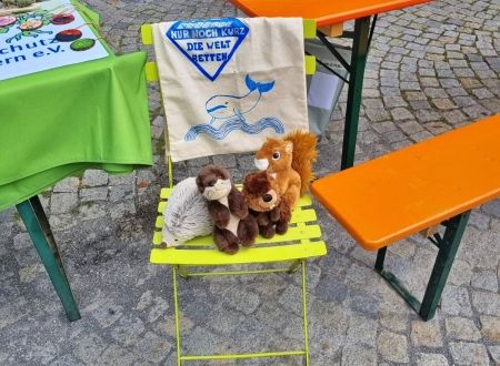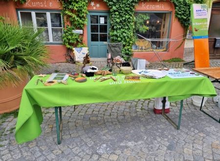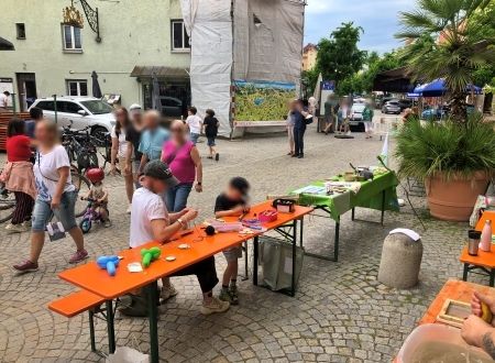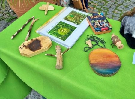 An unserem Stand zeigten wir verschiedene Arbeiten aus vergangenen Ferienprogrammen und aus der Kindergruppe, darunter Schnitzereien, Glutschalen und handgeschöpftes Papier. Außerdem konnten die Kinder bei uns selbst Papier schöpfen und malen.